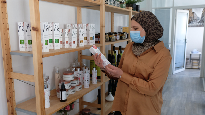 A trade director of Moroccan cosmetics company IntelCare checks the company’s products in Casablanca on October 9. They are on display at the Third CIIE via cloud participation (XINHUA)