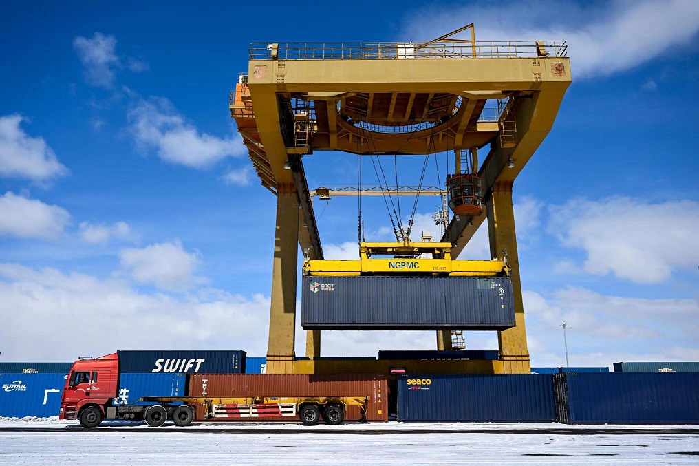 Photo taken on Mar. 15, 2023 shows a truck loading containers in Manzhouli, north China’s Inner Mongolia Autonomous Region. (Photo/Xinhua)