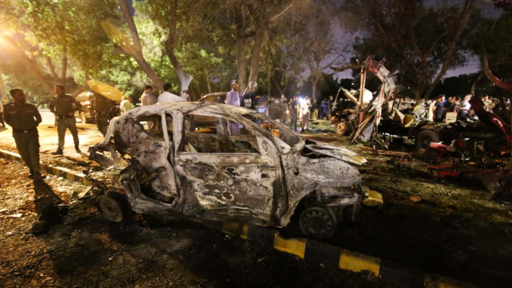 This photo taken on Oct. 7, 2024 shows destroyed cars at the site of a terrorist attack near Jinnah International Airport in Karachi, Pakistan’s south Sindh province. (Photo/Xinhua)