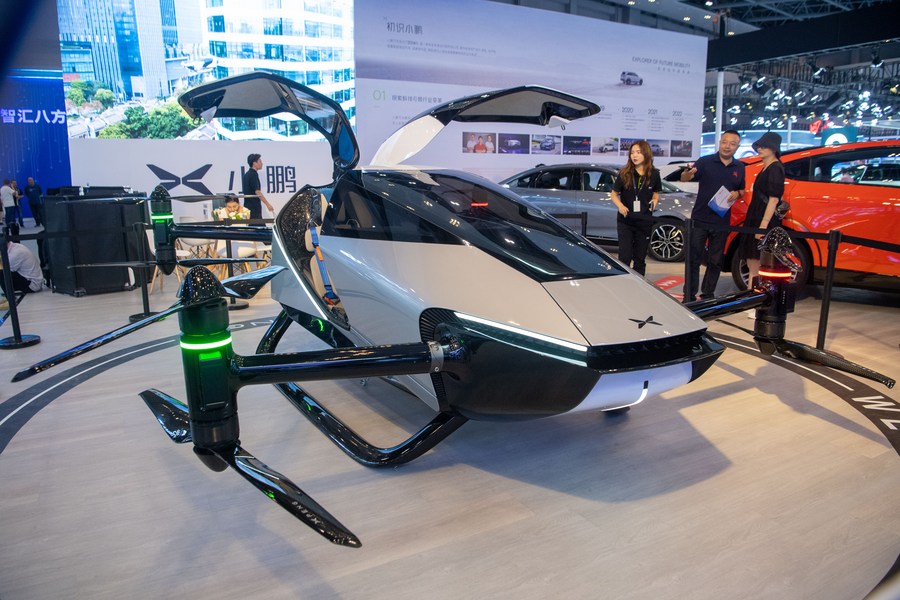 Visitors look at a Xpeng X2 flying car on display during the Smart China Expo 2023 in southwest China’s Chongqing Municipality, Sept. 4, 2023. (Photo/Xinhua)