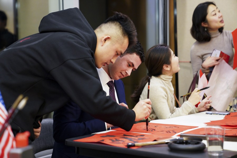 Students write Chinese calligraphy during a New Year gala for Chinese and international youth in New York, the United States, Jan. 19, 2020. (Photo/Xinhua)