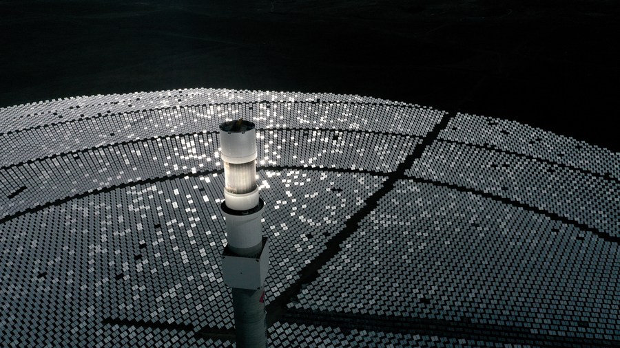 Aerial photo taken on Mar. 3, 2021 shows a solar thermal power project in Gonghe County, northwest China’s Qinghai Province. (Photo/Xinhua)