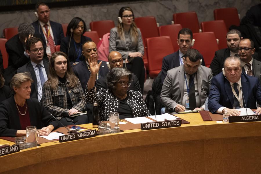 U.S. ambassador to the United Nations Linda Thomas-Greenfield (C, front) votes against a Gaza-related Security Council draft resolution at the UN headquarters in New York, on Feb. 20, 2024. (Photo/Xinhua)