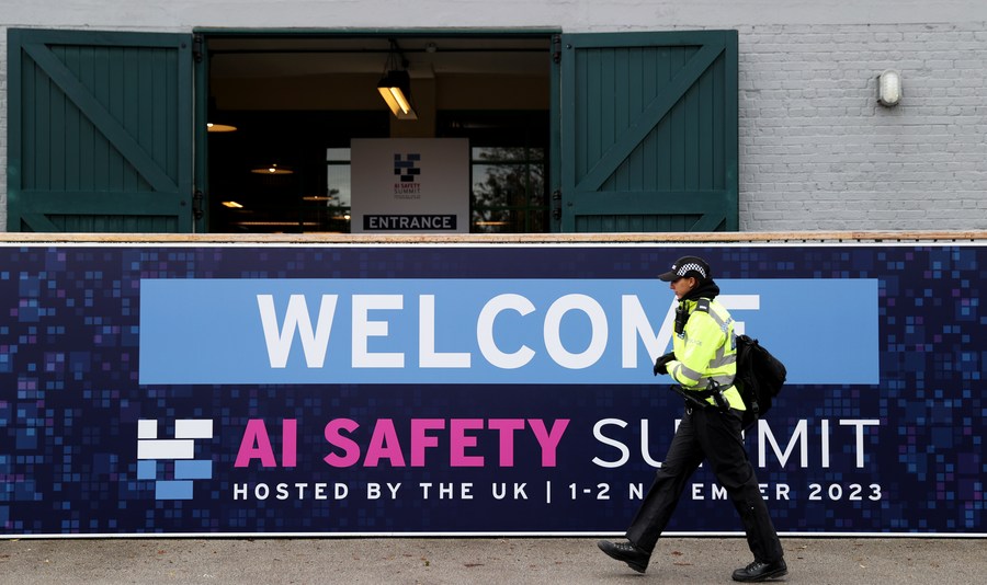 This photo taken on Nov. 2, 2023 shows a police officer on duty during AI Safety Summit in Bletchley Park, Britain. A declaration on artificial intelligence (AI) safety was issued during the summit here. (Photo/Xinhua)