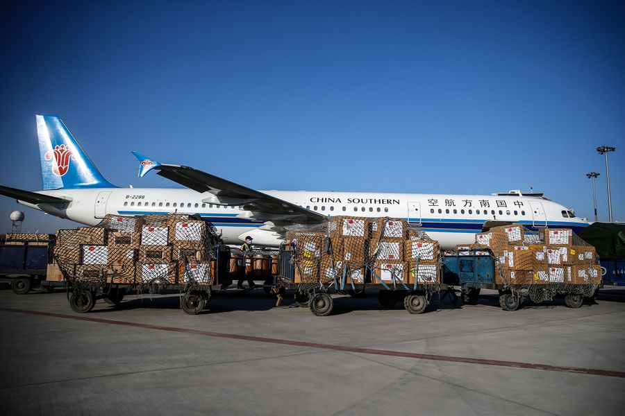 A staff member loads medical supplies onto a flight to the Republic of Korea (ROK) at Shenyang Taoxian International Airport in Shenyang, northeast China’s Liaoning Province, Mar. 16, 2020. (Photo/Xinhua)