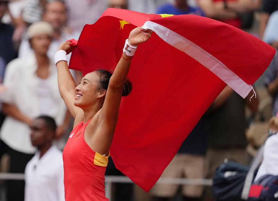 Zheng Qinwen of China celebrates after the women’s singles gold medal match of tennis against Donna Vekic of Croatia at the Paris 2024 Olympic Games in Paris, France, on Aug. 3, 2024. (Photo/Xinhua)