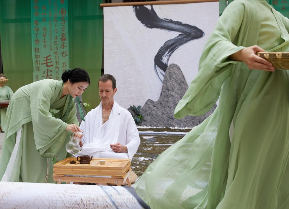 Artists perform traditional Chinese dance and tea art in Madrid, Spain, Jun. 8, 2023. (Photo/Xinhua)