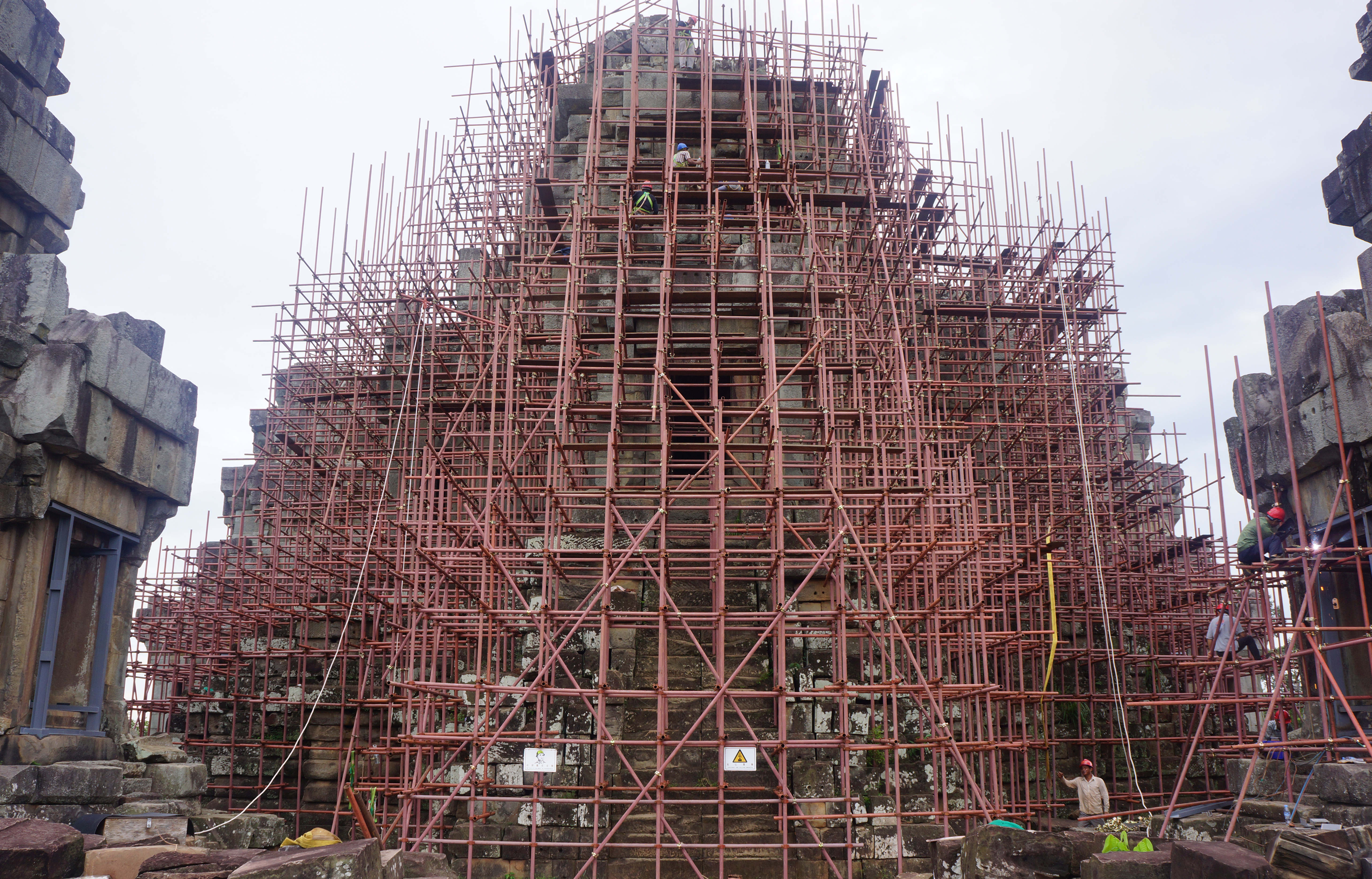 The whole mountain temple was built on three rectangular terraces, each raised above the next. At the center of the temple stands a quincunx of towers. From the ground outside the terraces to the highest point of the towers is 43.3 meters. The layers of stone steps to the Meru terraces measure nearly 90 degrees vertical. Archaeologists had to climb with their hands and feet to access the towers. The conservation work site was small and narrow, with a high risk of falls. Before they could do anything, the team had to build scaffolding on the periphery of the building with a tailored steel structure to provide maximum protection for the building itself.