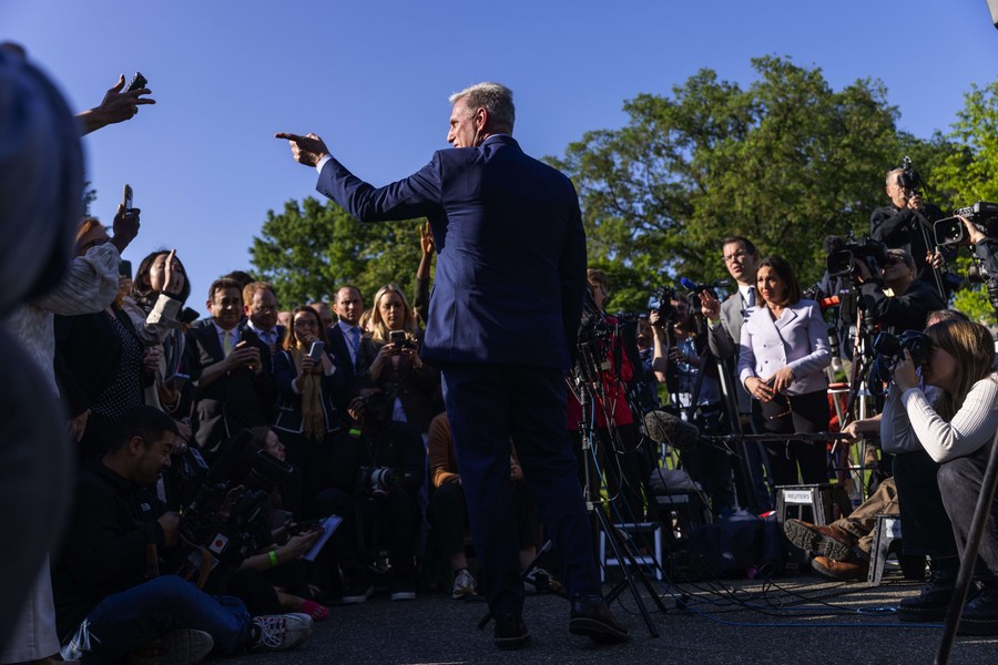 Republican House Speaker Kevin McCarthy speaks to the press after a high-profile debt ceiling meeting in Washington, D.C., the United States, May 9, 2023. (Photo/Xinhua)