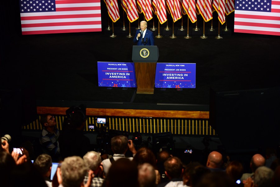U.S. President Joe Biden speaks at SUNY Westchester Community College in Valhalla, New York, the United States, on May 10, 2023. During the speech, Biden said the U.S. economy would fall into recession with 8 million Americans losing their jobs, and its international reputation would be damaged in the extreme in the case of a debt default. (Photo/Xinhua)