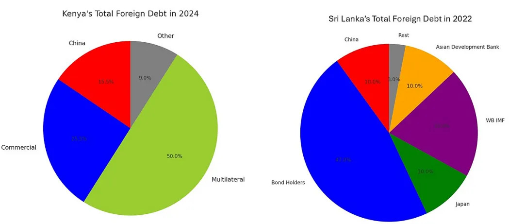 What is meant by “composition” is how much of a country’s total foreign debt is owed to various creditors, expressed as percentages [see Figure 1]. We immediately discovered that the portion owed to China represents only a fraction of the total debt (10% in Sri Lanka’s case in 2022 and 15.5% in Kenya’s case in 2024).