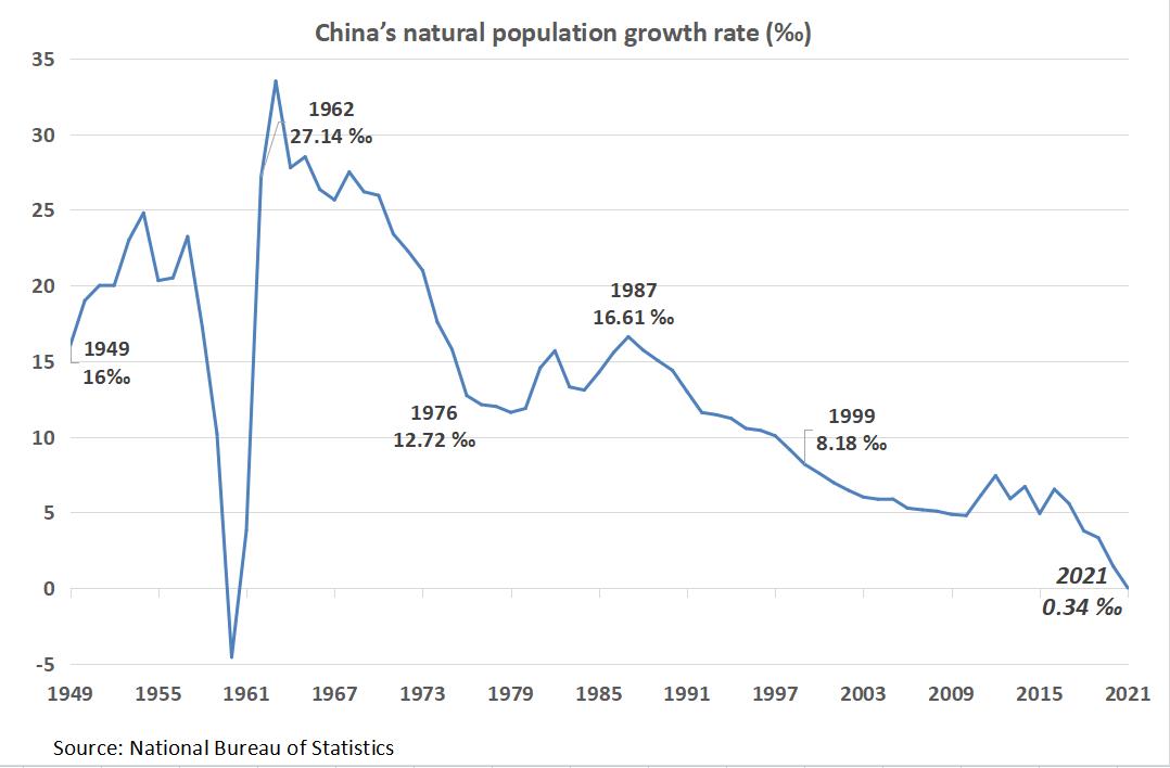 For the first time in decades, China’s birth rate fell below 10 per 1,000 people in 2020 (8.5 births per thousand), and in 2021, the figure plummeted to a new low, 7.52 per thousand. A continuation of this trend could mean that China’s population of 1.4126 billion has peaked and that net population growth in 2022 could be zero or negative.