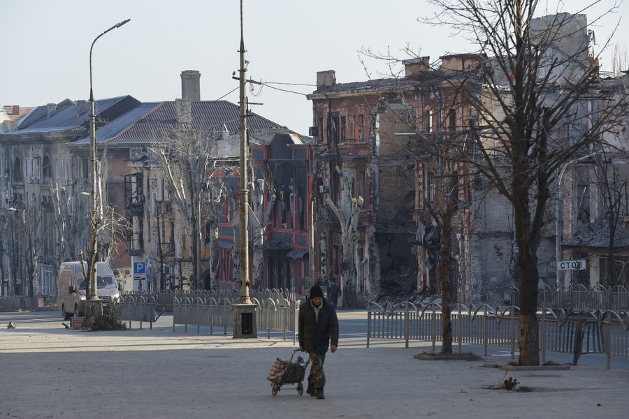 A man walks past damaged buildings in Mariupol, Jan. 27, 2023. (Photo/Xinhua)