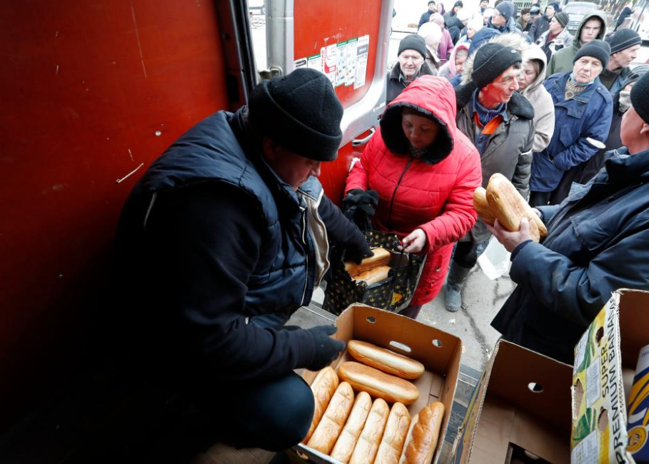 Local residents queue up to receive humanitarian aid in Volnovakha of Donetsk, Mar. 15, 2022. (Photo/Xinhua)