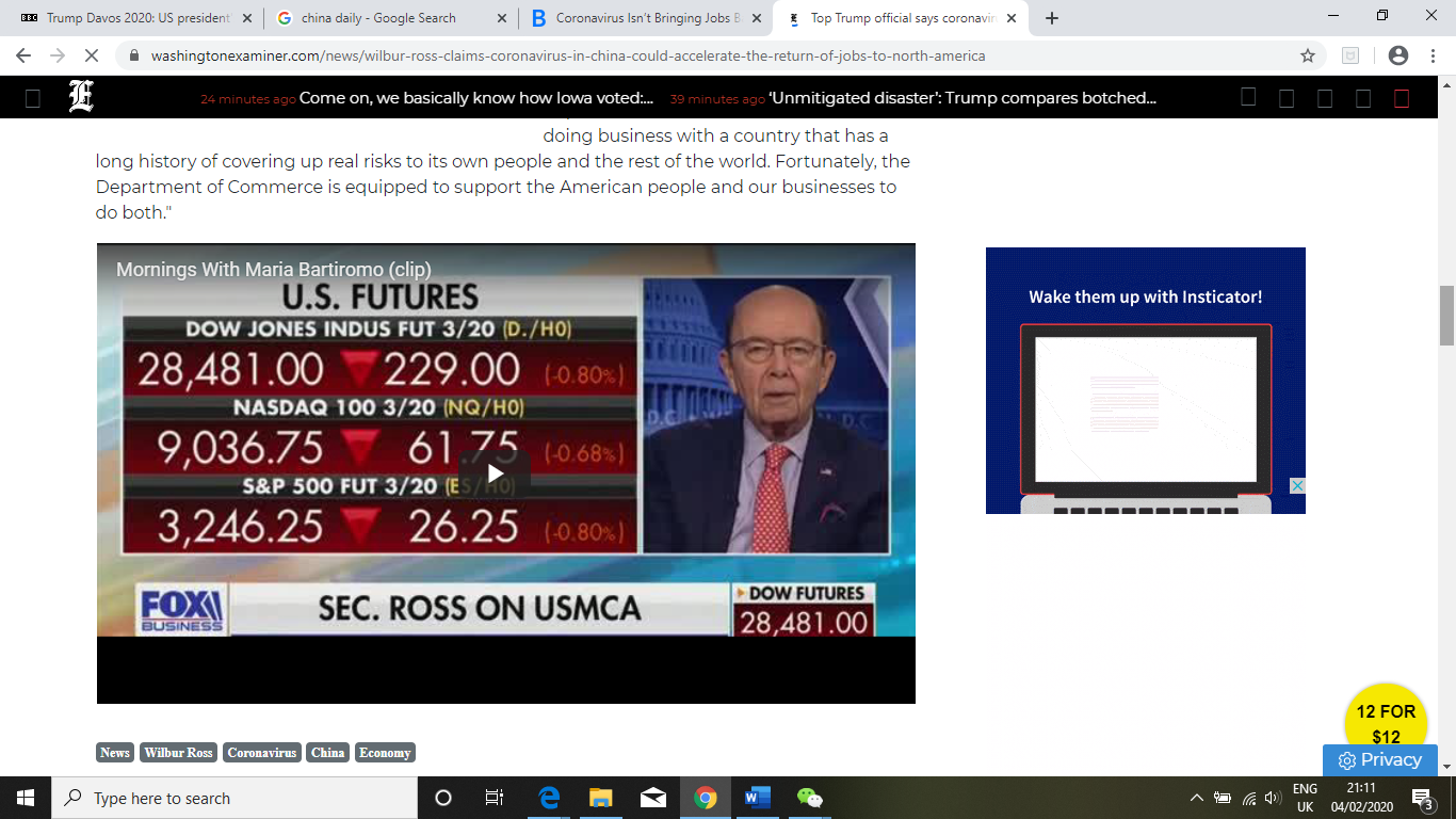 Speaking to Fox Business on January 30, US Commerce Secretary Wilbur Ross said the coronavirus will help bring jobs back to North America. The coronavirus “will help to accelerate the return of jobs to North America, some to U.S., probably some to Mexico as well .. the fact is, it does give businesses yet another thing to consider when they go through their review of their supply chain,” Ross said on the show.