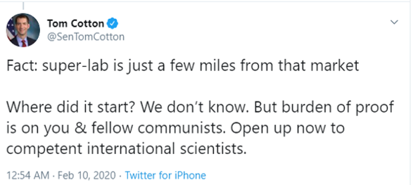 The origins of the virus are still causing much discussion, including for Senator Tom Cotton, a keen China hawk in the Republican party. He has continued to suggest that the virus was a man-made bio-weapon that leaked from the Wuhan Institute of Virology. On February 10, he further added to his theory, insinuating that a “super-lab” just miles from the market could be the viruses’ origin.