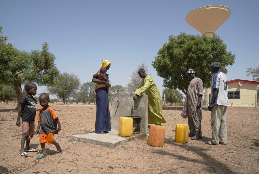 Villagers collect water at a Chinese-aided well in Tenefoul Toucouleur Village, Diourbel, Senegal, Mar. 20, 2023. (Photo/Xinhua)