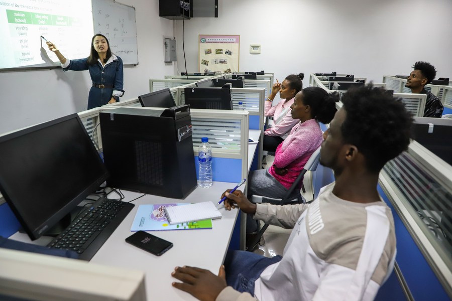 A Chinese teacher speaks in a lesson for local Ethiopian teachers at the Addis Ababa University in Addis Ababa, Ethiopia, Jan. 18, 2024. (Photo/Xinhua)