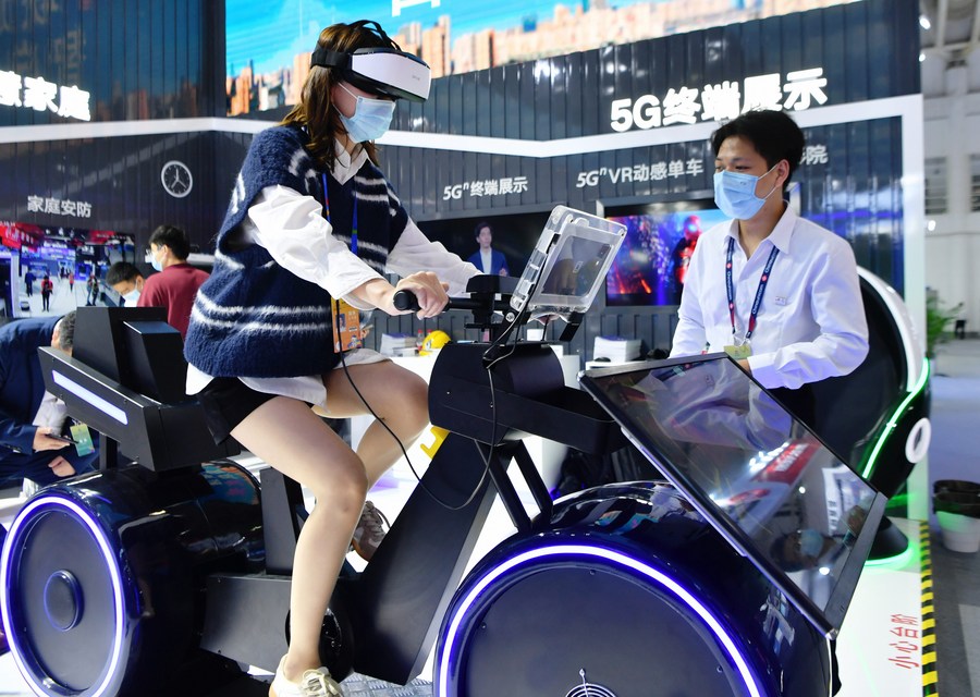 A visitor tries a VR spinning based on 5G technology at the digital achievements exhibition during the fourth Digital China Summit in Fuzhou, southeast China’s Fujian Province, Apr. 25, 2021. (Photo/Xinhua)