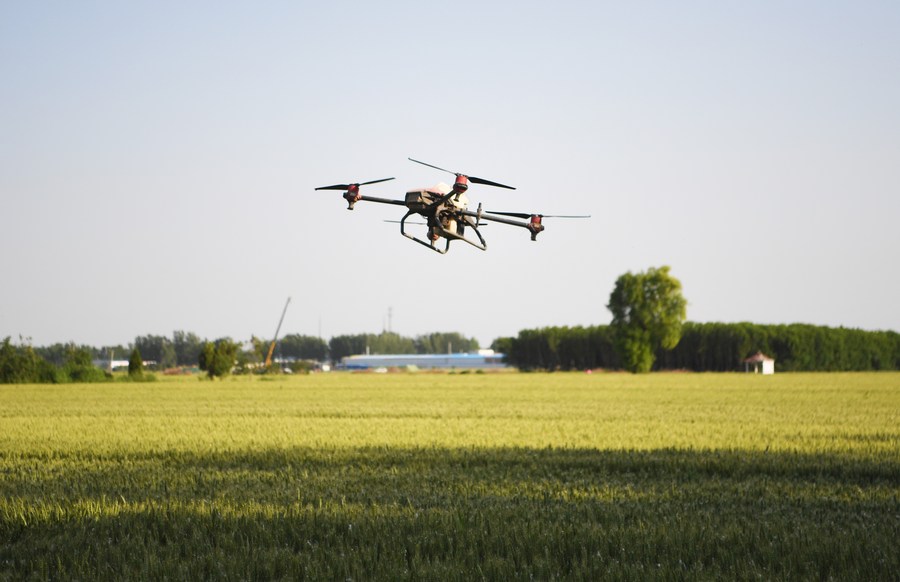 A drone is used to manage a wheat field in Lizhuang Village, Senggu Township, Yanjin County of Xinxiang City, central China’s Henan Province, May 17, 2022. (Photo/Xinhua)