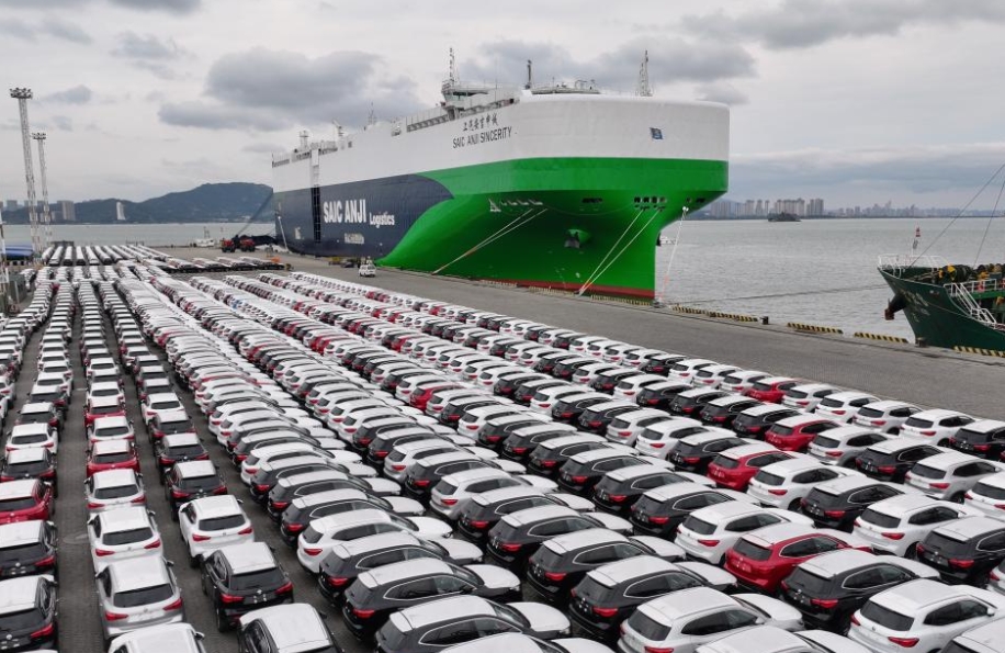 An aerial drone photo taken on Jan. 23, 2024 shows vehicles to be exported and SAIC Anji Sincerity ro-ro ship at Dongdu port area in Xiamen, southeast China’s Fujian Province. (Photo/Xinhua)