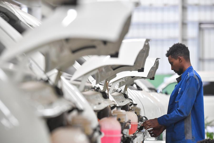 A worker assembles an electric minibus at a factory in Addis Ababa, capital of Ethiopia, Mar. 6, 2024. (Photo/Xinhua)
