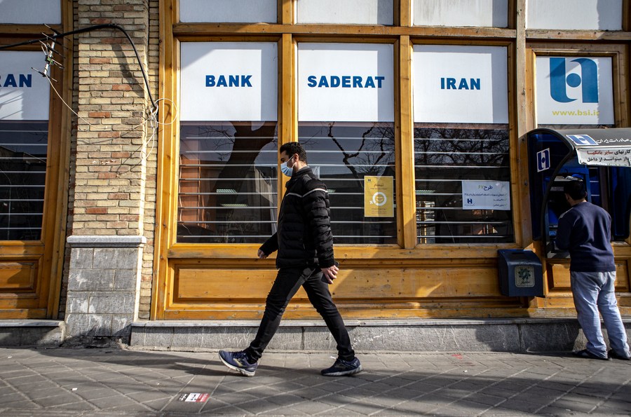 A man walks past an Iranian bank in Tehran, Iran, Jan. 28, 2021. (Photo/Xinhua)