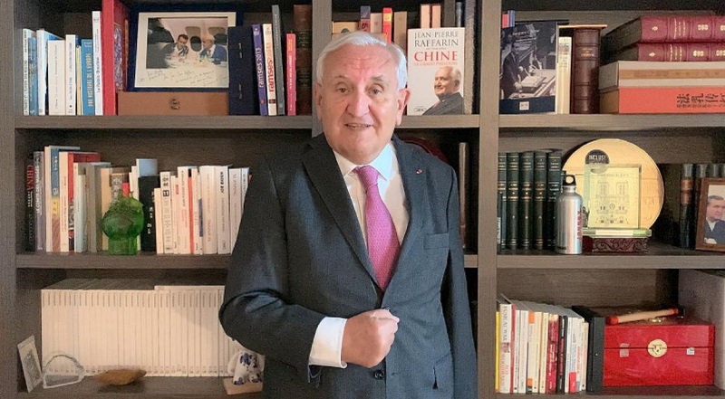 Jean-Pierre Raffarin, former prime minister of France and chairman of the Prospective and Innovation Foundation, delivers a speech at the opening ceremony via video link.