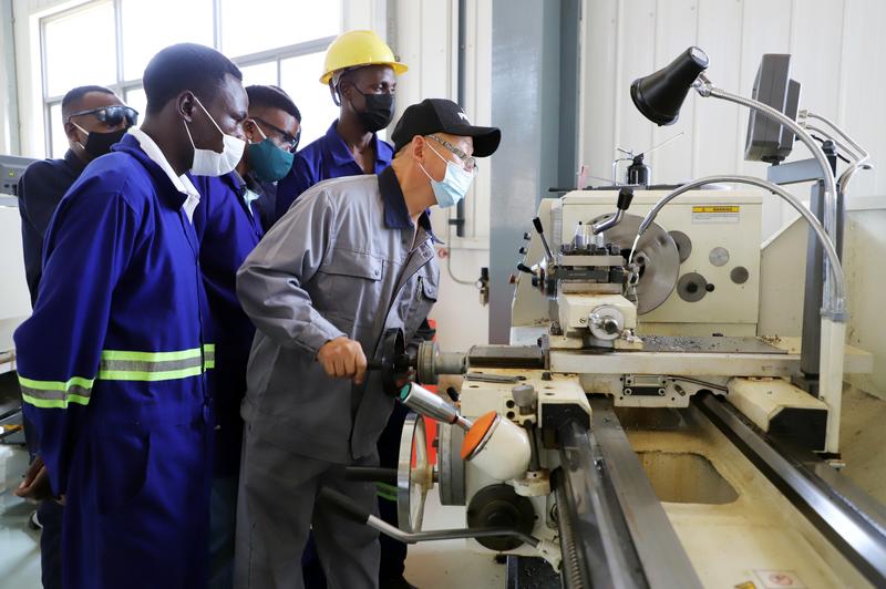 A Chinese instructor demonstrates measuring method to local trainees at the China-funded Uganda Industrial Research Institute at Namanve Industrial Park in Mukono district, Uganda, Nov. 9, 2021. (Photo/Xinhua)