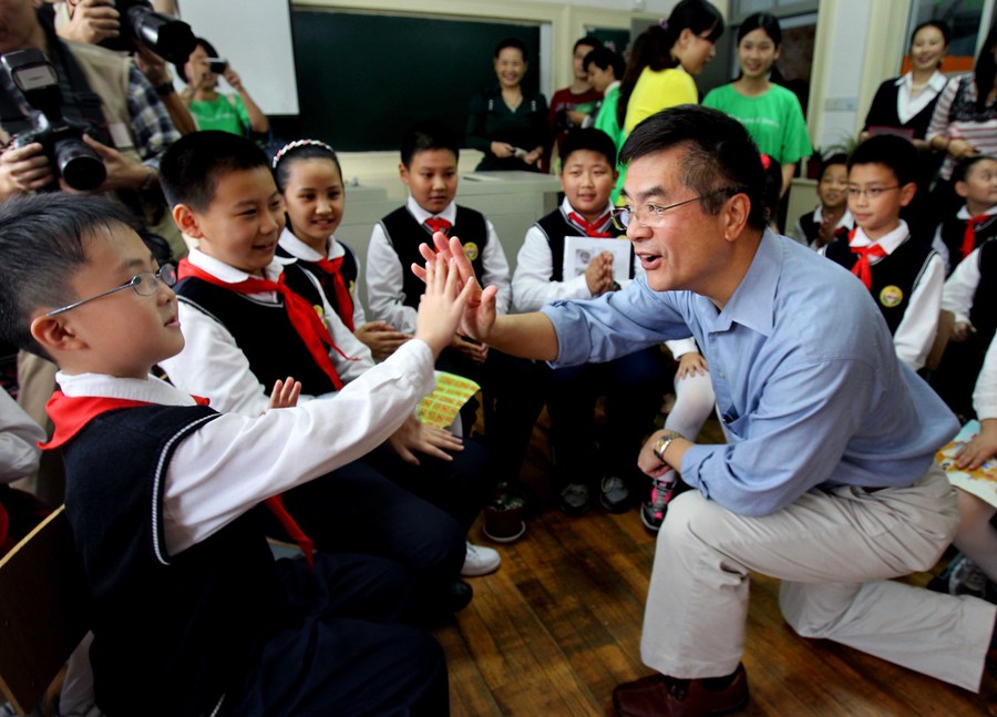 U.S. ambassador to China Gary Locke (R Front) talks with a young student during his visit in Jinzhou Primary School of east China’s Shanghai Municipality, Oct. 12, 2011. (Photo/Xinhua)