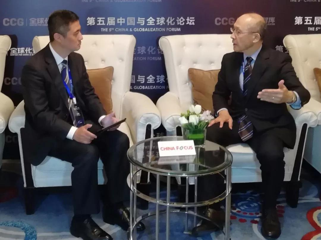 ▲Gao Anming and Masahiro Kawai (R), Specially Appointed Professor at the School of Public Policy at the University of Tokyo, Representative Director and Director- General of the Economic Research Institute for Northeast Asia, and former Dean of the Asian Development Bank Institute, exchange views on topics such as the Japanese government’s position on the Belt and Road Initiative at the 5th China and Globalization Forum in Beijing on April 14, 2019.