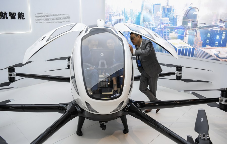 Visitors learn about an automatic aircraft on display at an exhibition during the “China 5G + Industrial Internet Conference” in Wuhan, central China’s Hubei Province, Nov. 19, 2020. (Photo/Xinhua)