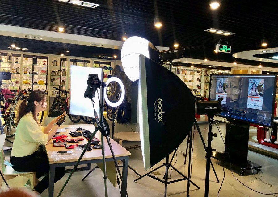 A staff member of Guangzhou Light Holdings Limited (GZLI) introduces exhibits via livestreaming during the 129th session of the China Import and Export Fair, in Guangzhou, south China’s Guangdong Province, Apr. 15, 2021. (Photo/Xinhua)