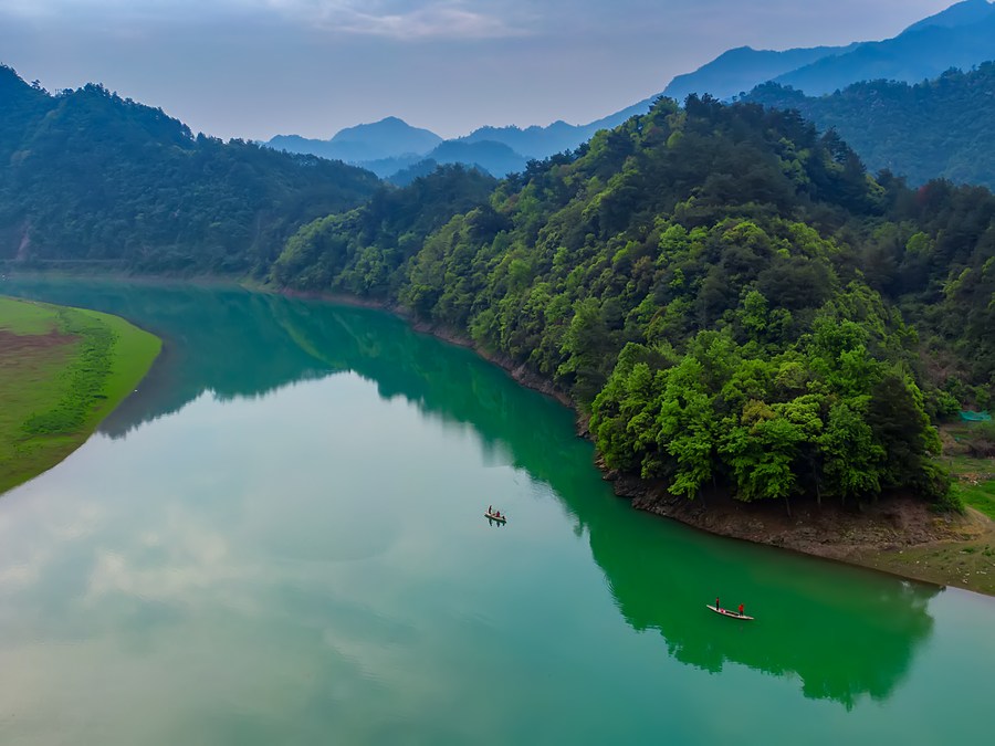 Aerial photo taken on Apr. 7, 2021 shows volunteers patrolling the lake to keep the water clean in Wuzhuang Village of Chun’an County, east China’s Zhejiang Province. (Photo/Xinhua)