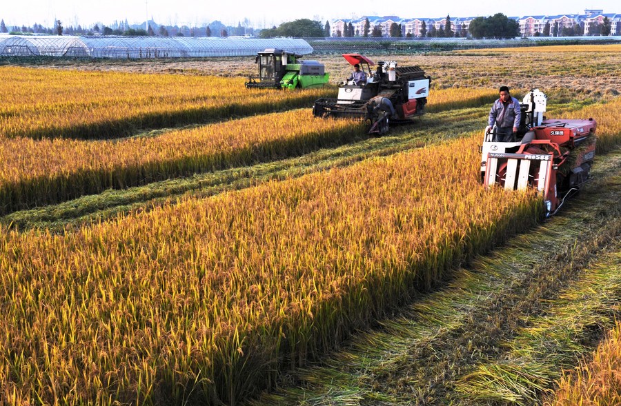 File photo taken on Nov. 22, 2019 shows farmers harvesting rice in Yiting Town of Yiwu City, east China’s Zhejiang Province. (Photo/Xinhua)