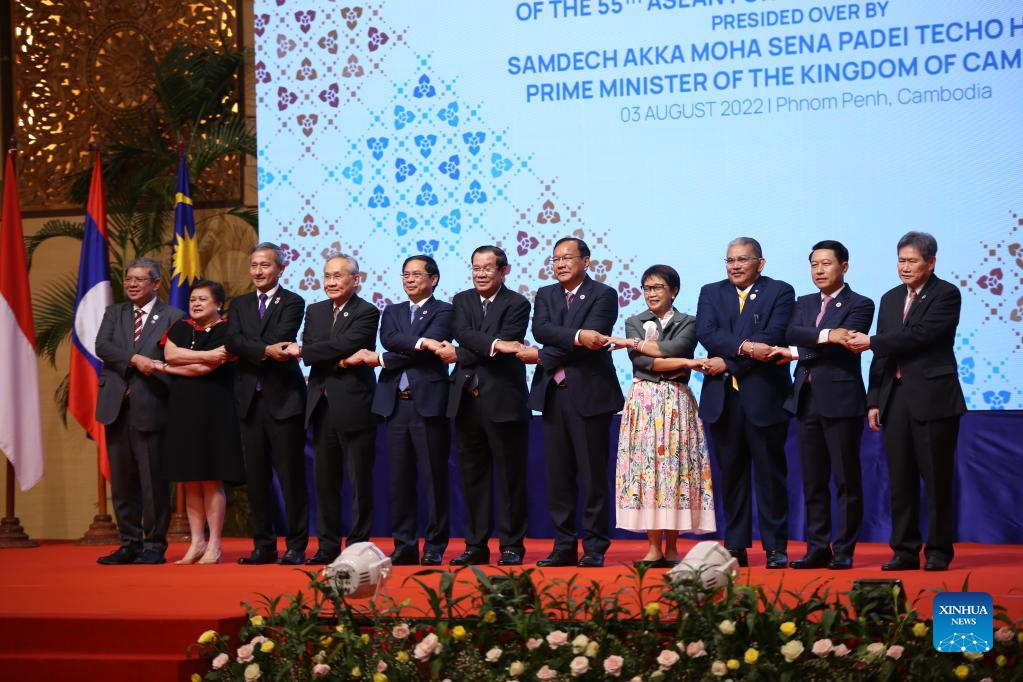 Attendees of the 55th ASEAN (the Association of Southeast Asian Nations) Foreign Ministers’ Meeting pose for a group photo in Phnom Penh, Cambodia, on Aug. 3, 2022. (Photo/Xinhua)