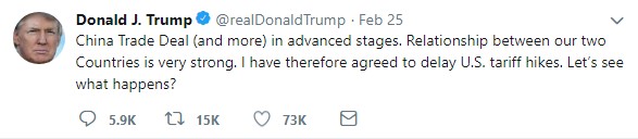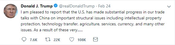 On February 25, Trump said in a speech at the annual meeting of the National Governors Association held at the White House that the Chinese delegation would soon return to the U.S., and that he would hold a summit with Chinese President Xi Jinping and sign the trade agreement. He also warned, however, that it remains possible that the two countries would not reach any agreement.