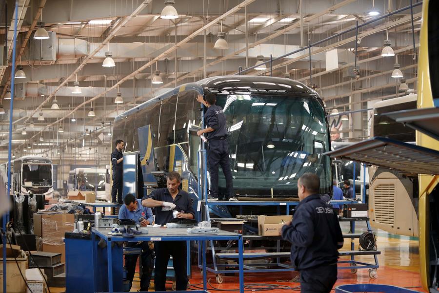 Workers assemble a bus at a factory of Egypt’s Geyushi Automotive Industry in Sharqia Province, Egypt, on Mar. 10, 2025. (Photo/Xinhua)