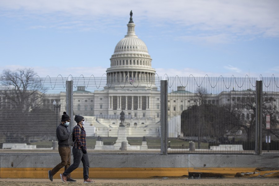 People wearing face masks walk past the U.S. Capitol building in Washington, D.C., the United States, Jan. 24, 2021. (Photo/Xinhua)