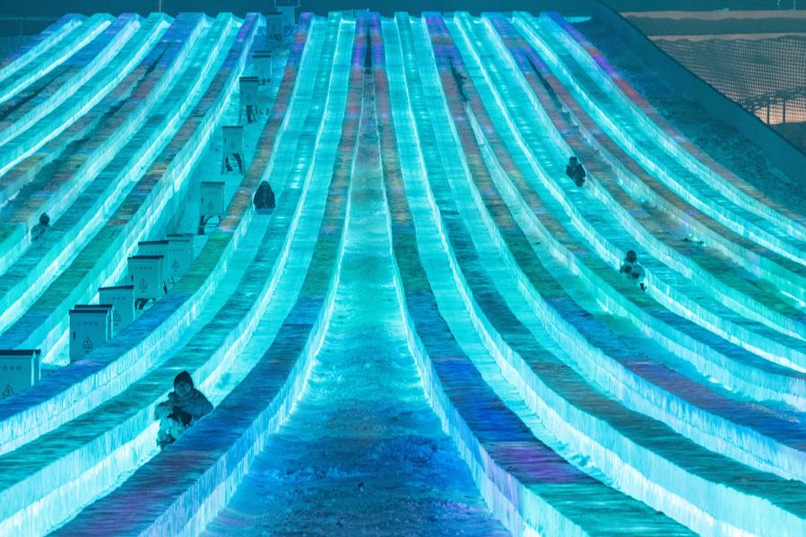 Tourists enjoy rides on an ice slide at Harbin Ice-Snow World in Harbin, northeast China’s Heilongjiang Province, Jan. 2, 2024. (Photo/Xinhua)