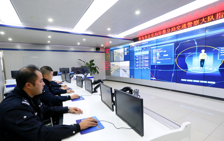 At a police station in Qingdao, Shandong Province in east China, policemen monitor vehicles on an intelligent traffic accident analysis system on December 12, 2019 (XINHUA)
