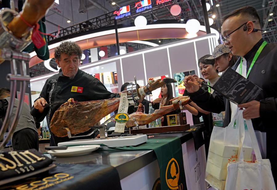 Visitors line up to taste Spanish ham during the seventh China International Import Expo (CIIE) in east China’s Shanghai, Nov. 6, 2024. (Photo/Xinhua)