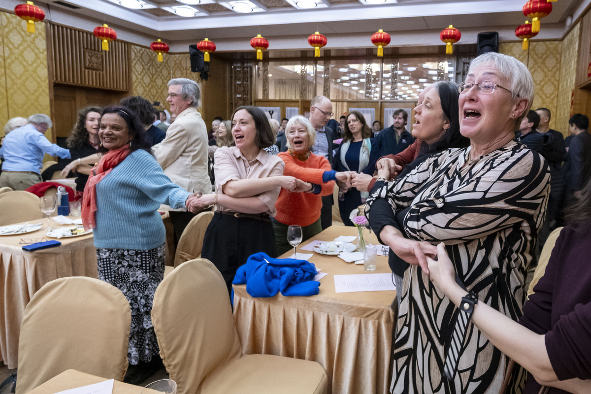 Guests hold hands and sing Auld Lang Syne at a reception for the families of the Lisbon Maru survivors in London, Britain, on Feb 22, 2025. (Photo/Xinhua)