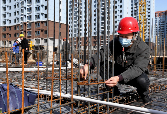 Huang Jiusheng, a construction project manager, checks the spacing of steel bars on a construction site in Xinzheng, Henan Province in central China, on March 12 (Photo/Xinhua)