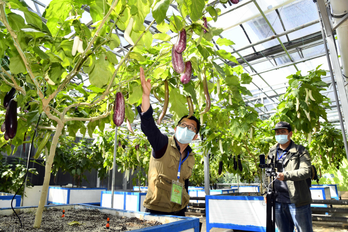 A man live-streams during a vegetable exhibition in Shouguang, Shandong Province in east China, on April 20 (Photo/Xinhua)
