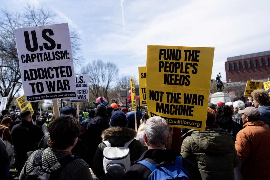 Protesters gather during the anti-war demonstration in Washington, D.C., the United States, Mar. 18, 2023. (Photo/Xinhua)