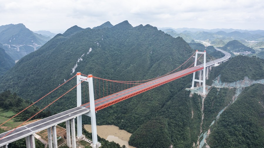 Aerial photo taken on May 31, 2022 shows cars running on the Yangbaoshan grand bridge along the Guiyang-Huangping Highway in southwest China’s Guizhou Province. (Photo/Xinhua)