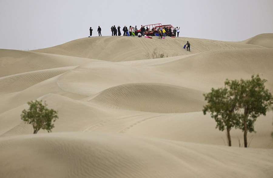 Tourists have fun at a desert in Makit County, northwest China’s Xinjiang Uygur Autonomous Region, May 26, 2023. (Photo/Xinhua)