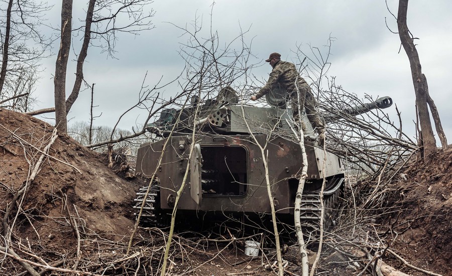 A Ukrainian soldier covers an armored vehicle with branches in Donbass on Apr. 12, 2022. (Photo/Xinhua)