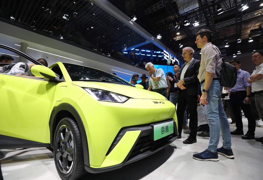 A BYD Seagull is displayed at the 20th Shanghai International Automobile Industry Exhibition in Shanghai, east China, Apr. 18, 2023. (Photo/Xinhua)
